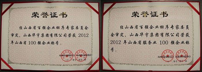 華宇集團(tuán)榮獲“2012山西企業(yè)100強(qiáng)”第48名和“2012山西服務(wù)企業(yè)100強(qiáng)”第14名。