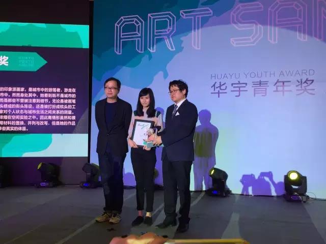 策展人孫冬冬、華宇青年獎總策劃人趙屹松為藝術(shù)家高倩彤頒發(fā)評委會特別獎